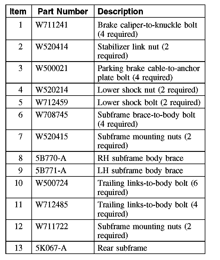 CAUTION: Suspension and subframe fasteners are critical parts because they affect performance of vital parts and systems and their failure may result in major service expense. A new part with the same part number must be installed if installation becomes necessary. Do not use a replacement part of lesser quality or substitute design. Torque values must be used as specified during reassembly to make sure of correct retention of these parts.