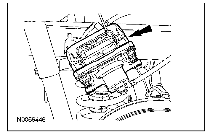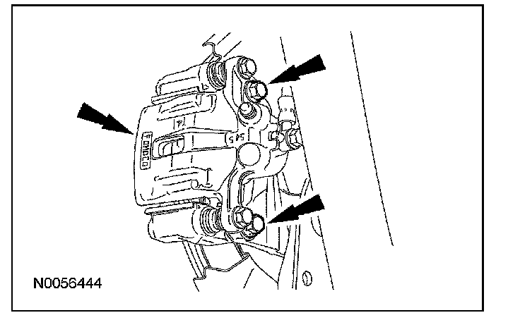 7. CAUTION: Do not allow the brake caliper and anchor plate assembly to hang from the brake hose or damage to the hose may occur.