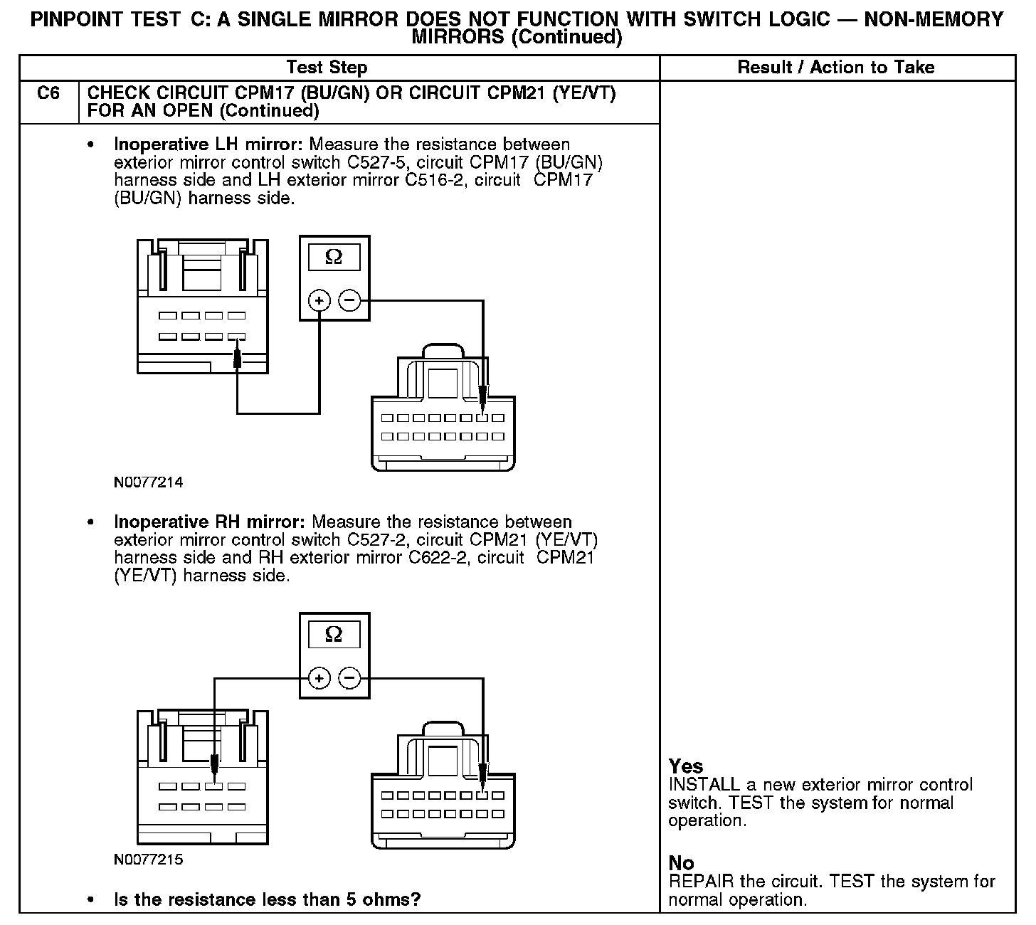 - When the LH/RH exterior mirror motor receives power through circuit CPM17 (BU/GN) or CPM21 (YE/VT) and ground through circuit CPM23 (GY), the LH or RH exterior mirror motor will operate upward.