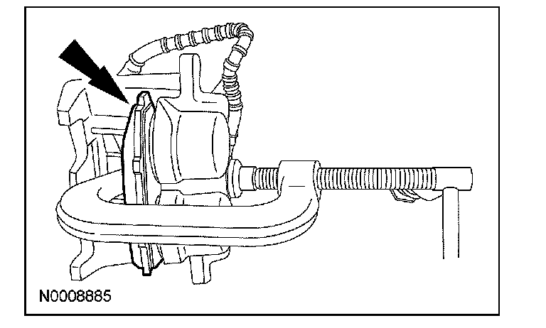 CAUTION: Do not allow the brake caliper to hang from the brake hose or damage to the hose can occur.