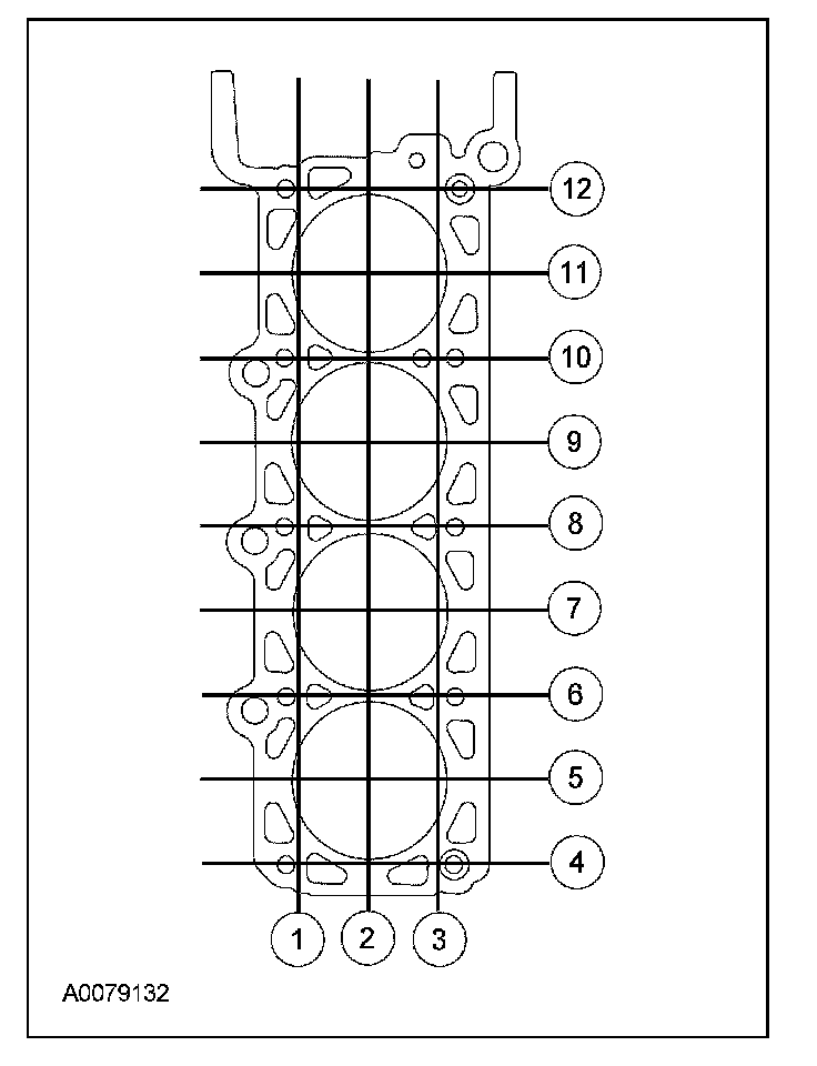 Using a straightedge and a feeler gauge, inspect the cylinder head for flatness in the sequence shown.
