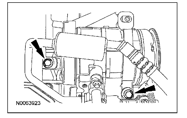 5. NOTE: The A/C compressor must be installed on the cylinder block and the 2 bolts tightened prior to installing the oil pan.
