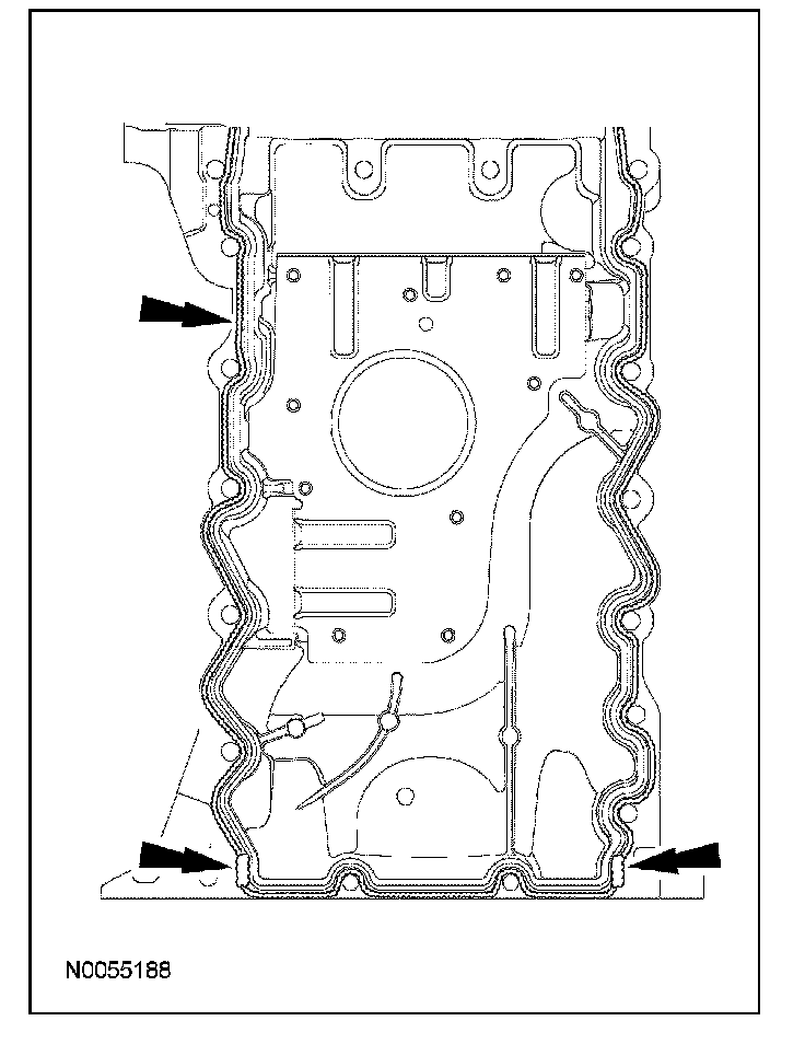 ^ Apply a 5.5 mm (0.21 in) bead of Motorcraft High Performance Engine RTV Silicone to the 2 crankshaft seal retainer plate-to-cylinder block joint areas on the sealing surface of the oil pan.
