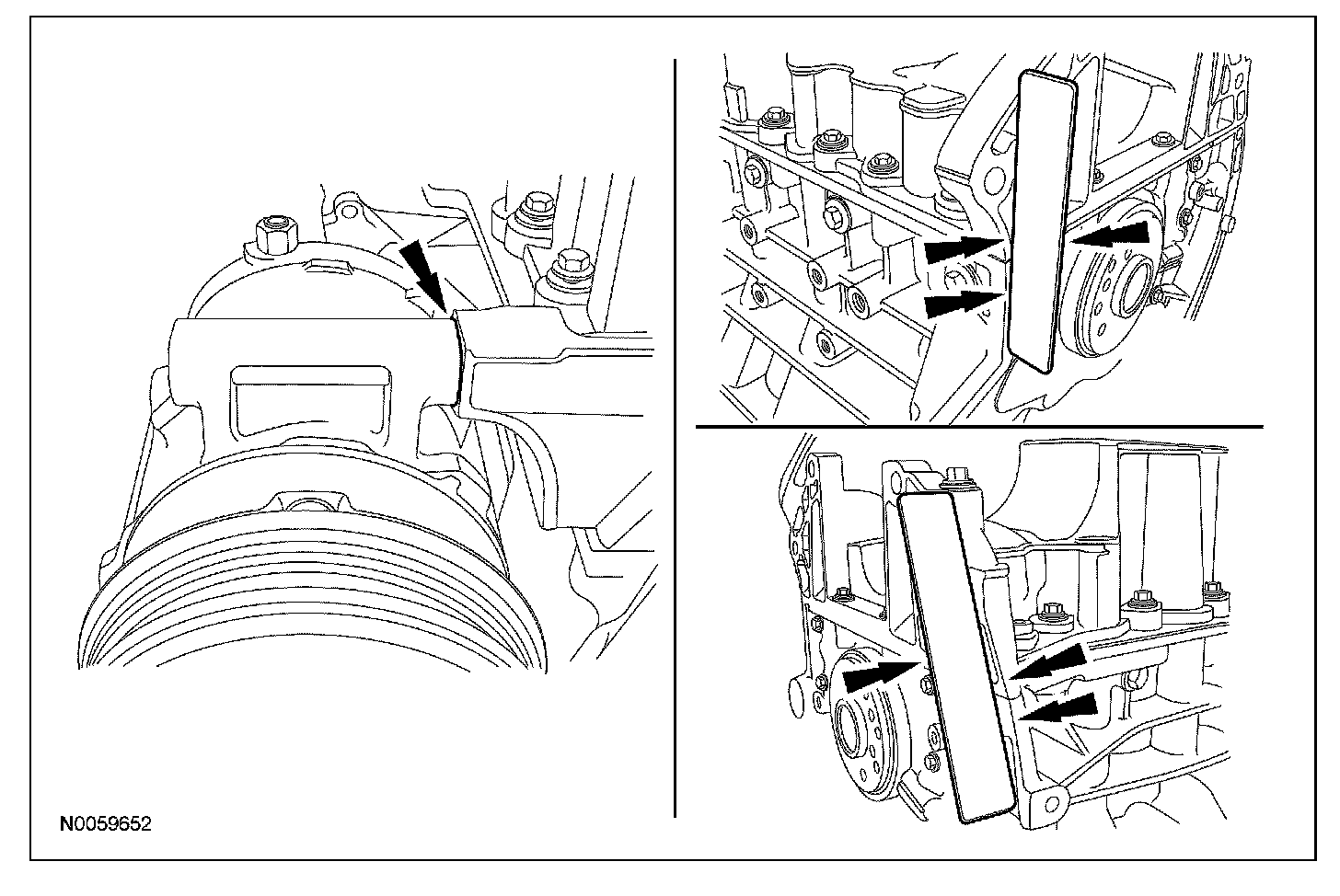 ^ Position the oil pan so the mounting boss is against the A/C compressor and using a straightedge, align the oil pan flush with the rear of the cylinder block at the 2 areas shown.