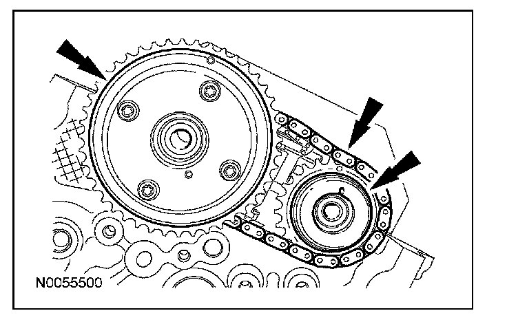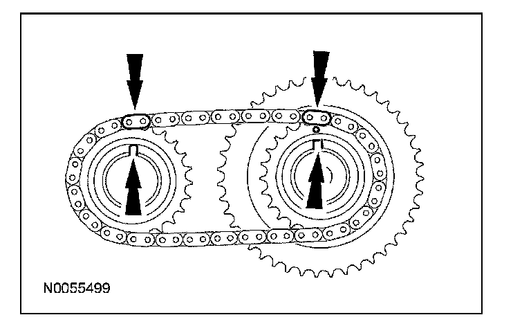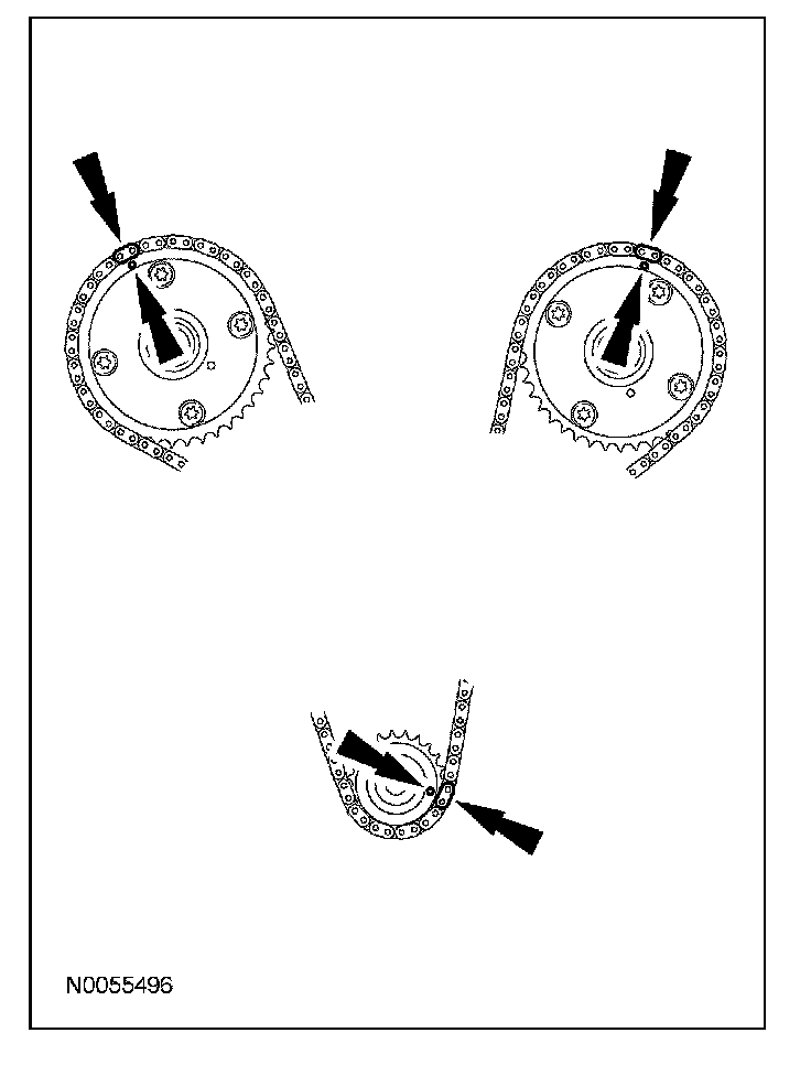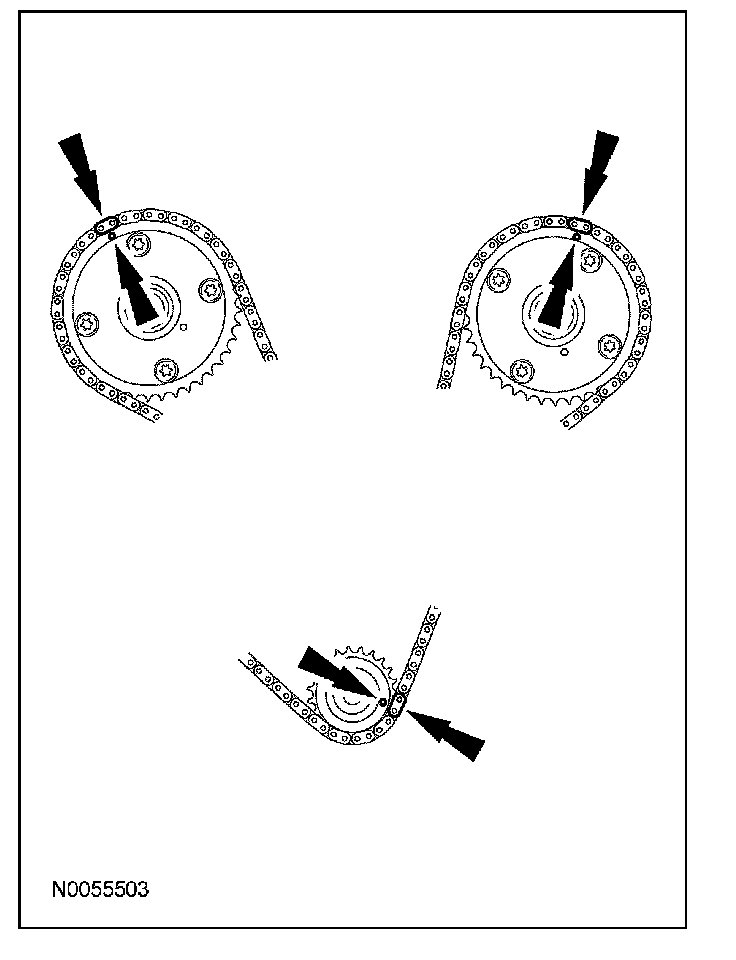 41. Install the primary timing chain with the colored links aligned with the timing marks on the VCT assemblies and the crankshaft sprocket.