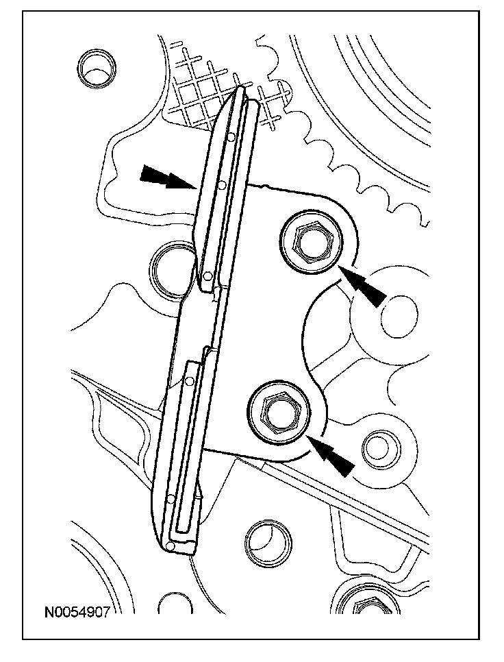 43. Install the lower LH primary timing chain guide and the 2 bolts.