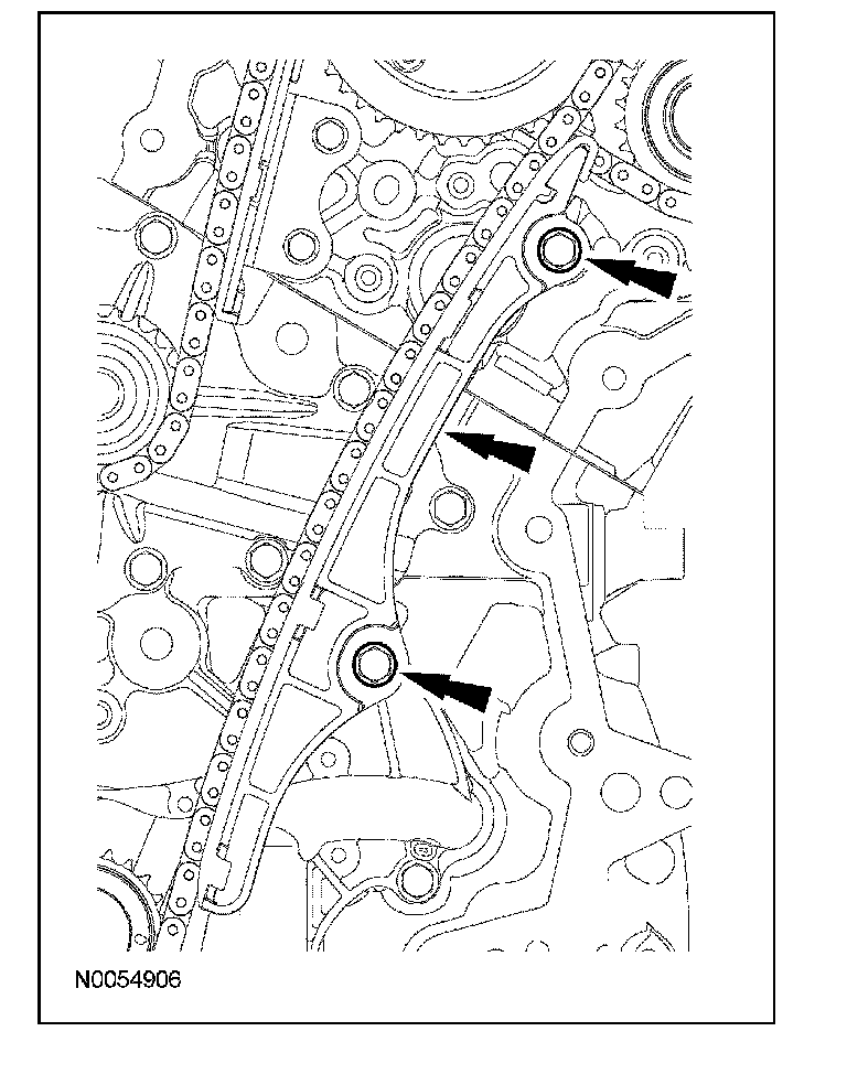 42. Install the upper LH primary timing chain guide and the 2 bolts.