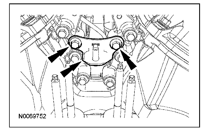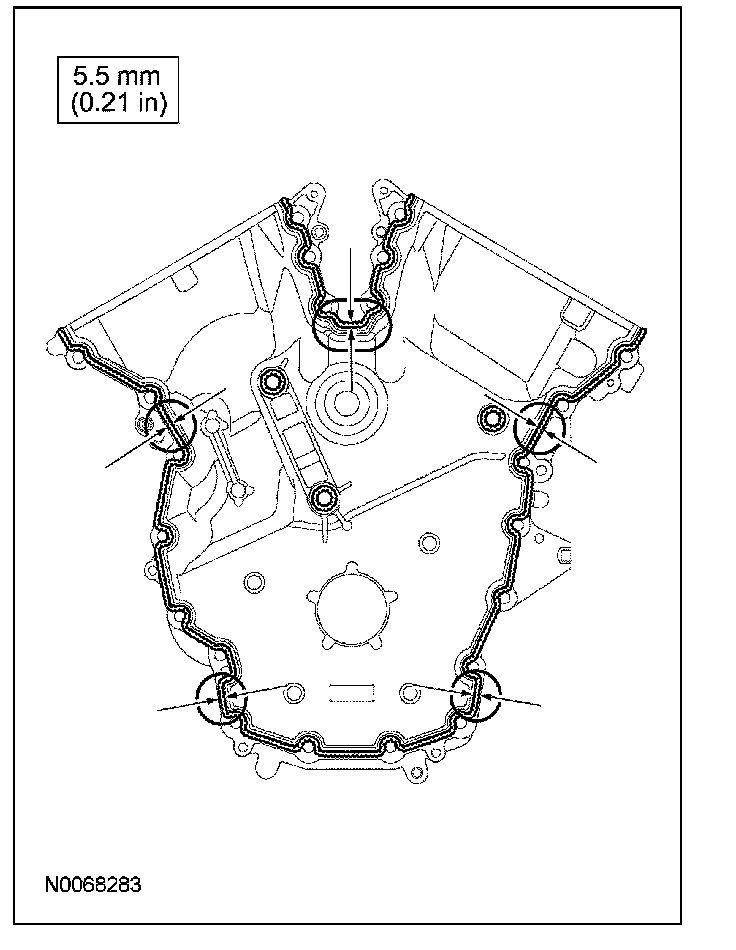 ^ Apply a 5.5 mm (0.21 in) bead of Motorcraft High Performance Engine RTV Silicone to the oil pan-to-cylinder block joint and the cylinder head-to-cylinder block joint areas of the engine front cover in 5 places as indicated.