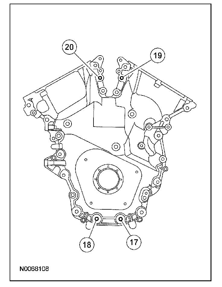 NOTE: The engine front cover and bolts 17, 18, 19 and 20 must be installed within 4 minutes of the initial sealant application. The remainder of the engine front cover bolts and the engine mount bracket bolts must be installed and tightened within 35 minutes of the initial sealant application. If the time limits are exceeded, the sealant must be removed, the sealing area cleaned and sealant reapplied. To clean the sealing area, use silicone gasket remover and metal surface prep. Follow the directions on the packaging. Failure to follow this procedure can cause future oil leakage.