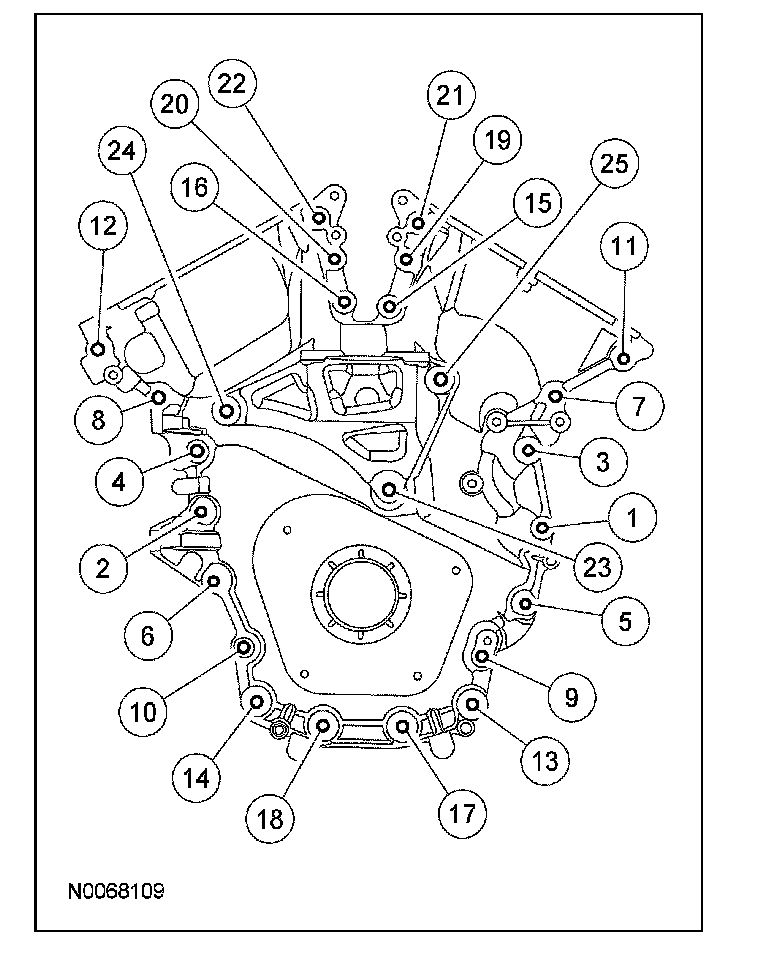 ^ Stage 1: Tighten bolts 1 thru 22 to 10 Nm (89 lb-in) and bolts 23, 24 and 25 to 15 Nm (11 lb-ft).