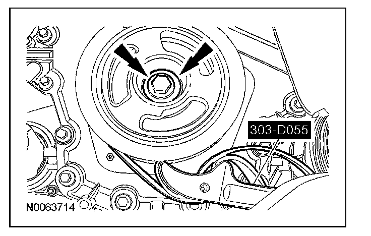 ^ Align the hole in the lever with the hole in the tensioner housing.