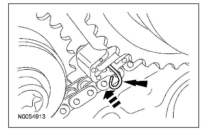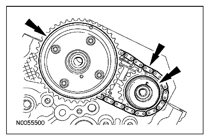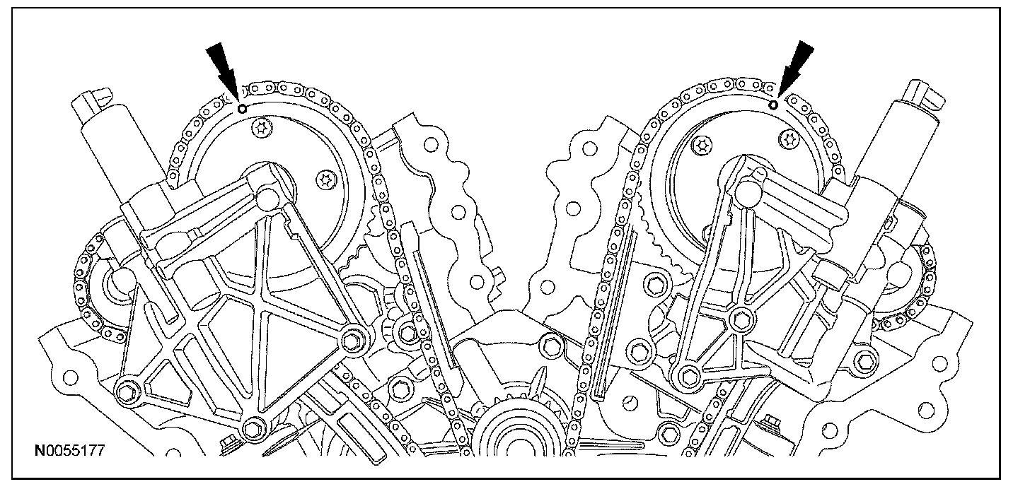 13. Install the primary timing chain with the colored links aligned with the timing marks on the VCT assemblies and the crankshaft sprocket.