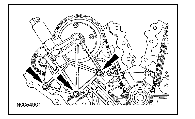 18. NOTE: The VCT bolt and the exhaust camshaft bolt must be discarded and new ones installed. However, the exhaust camshaft washer is reusable.