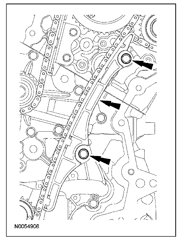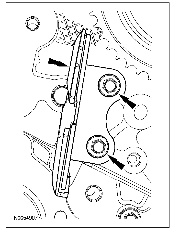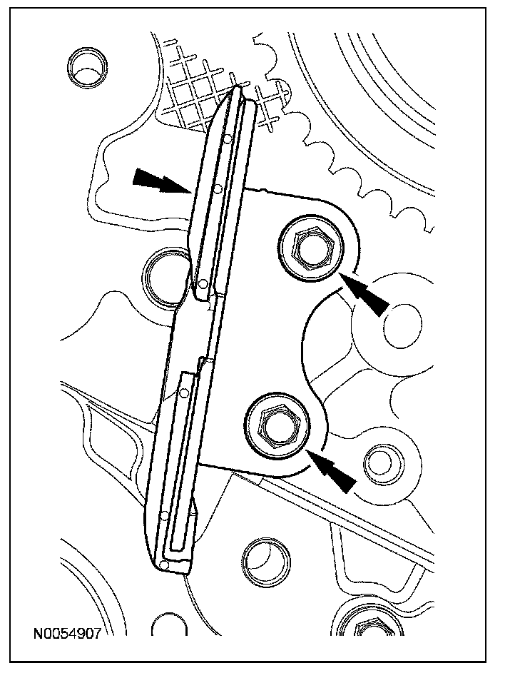 15. Install the lower LH primary timing chain guide and the 2 bolts.