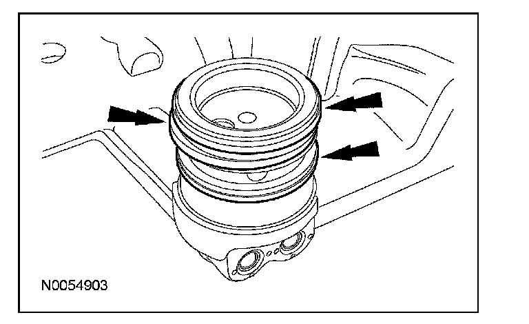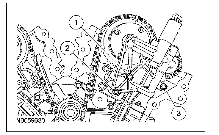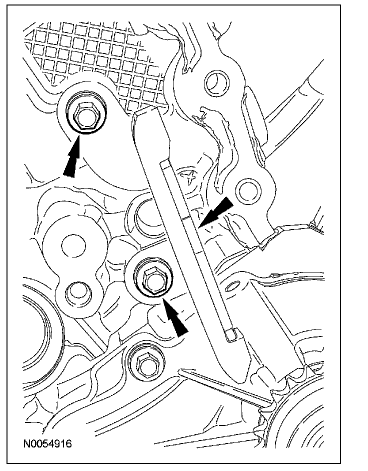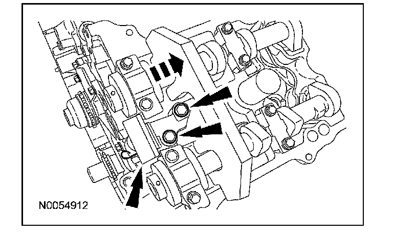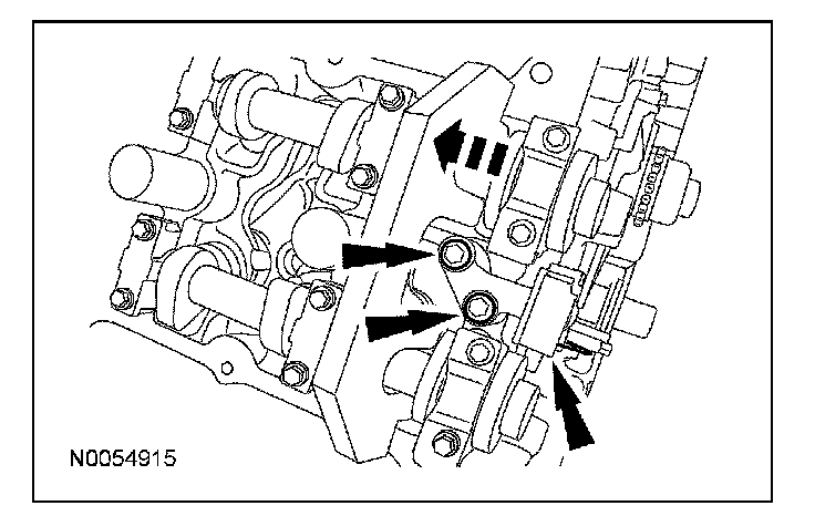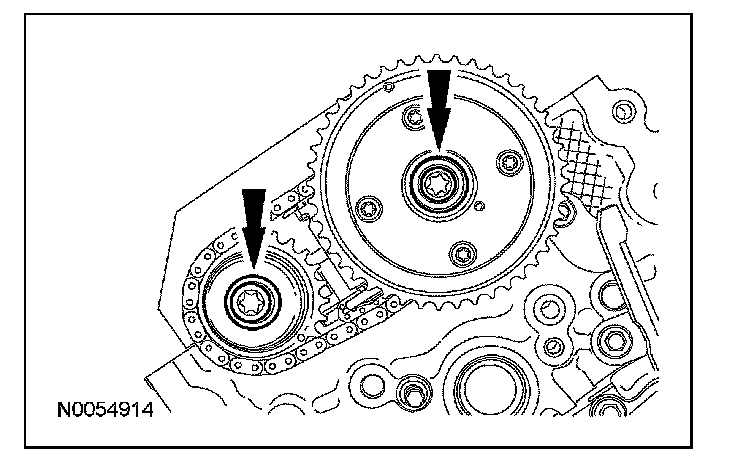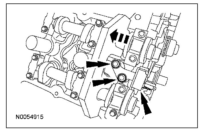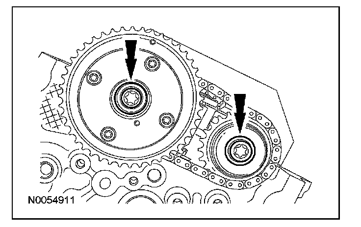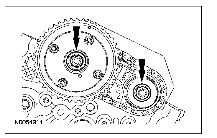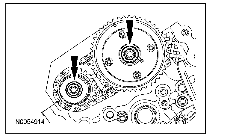 15. NOTE: The VCT bolt and the exhaust camshaft bolt must be discarded and new ones installed. However, the exhaust camshaft washer is reusable.