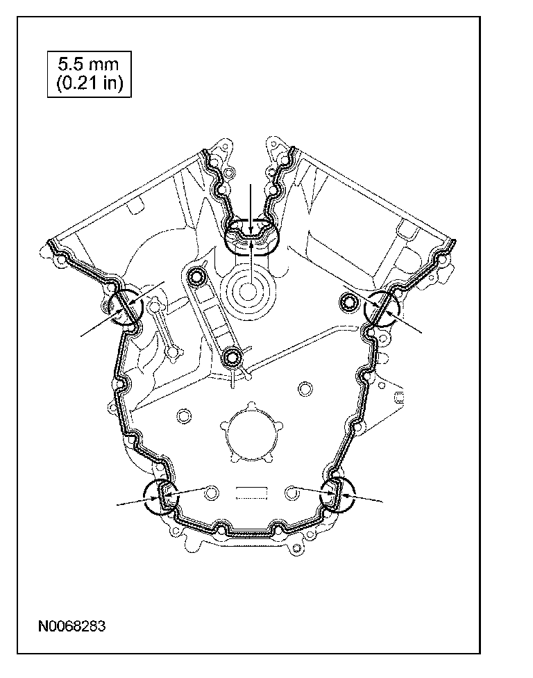 ^ Apply a 5.5 mm (0.21 in) bead of Motorcraft High Performance Engine RTV Silicone to the oil pan-to-cylinder block joint and the cylinder head-to-cylinder block joint areas of the engine front cover in 5 places as indicated.