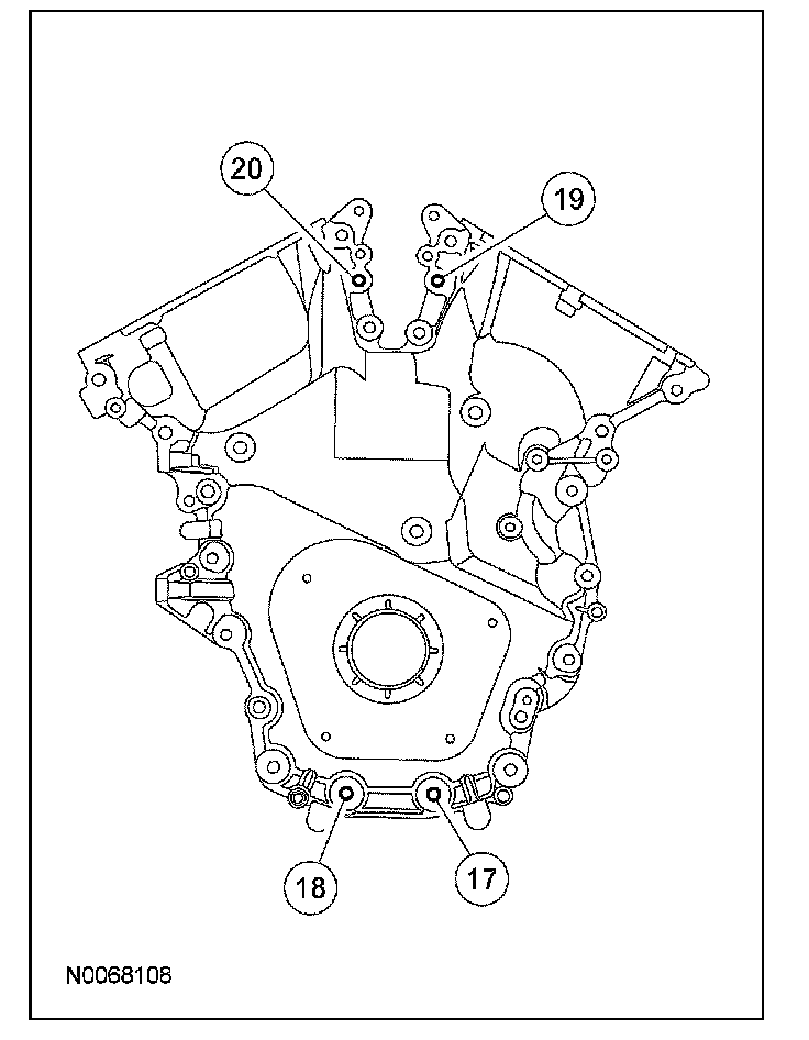 NOTE: The engine front cover and bolts 17, 18, 19 and 20 must be installed within 4 minutes of the initial sealant application. The remainder of the engine front cover bolts and the engine mount bracket bolts must be installed and tightened within 35 minutes of the initial sealant application. If the time limits are exceeded, the sealant must be removed, the sealing area cleaned and sealant reapplied. To clean the sealing area, use silicone gasket remover and metal surface prep. Failure to follow this procedure can cause future oil leakage.