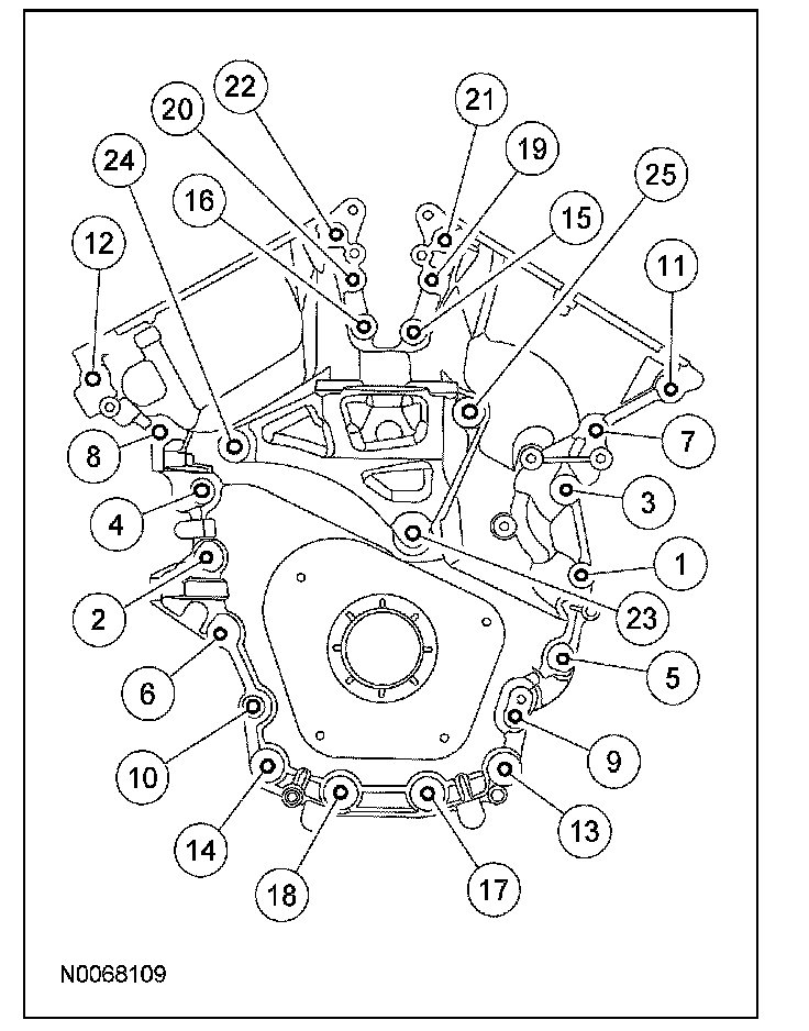 ^ Stage 2: Tighten bolts 1 thru 22 to 24 Nm (18 lb-ft) and bolts 23, 24 and 25 to 75 Nm (55 lb-ft).
