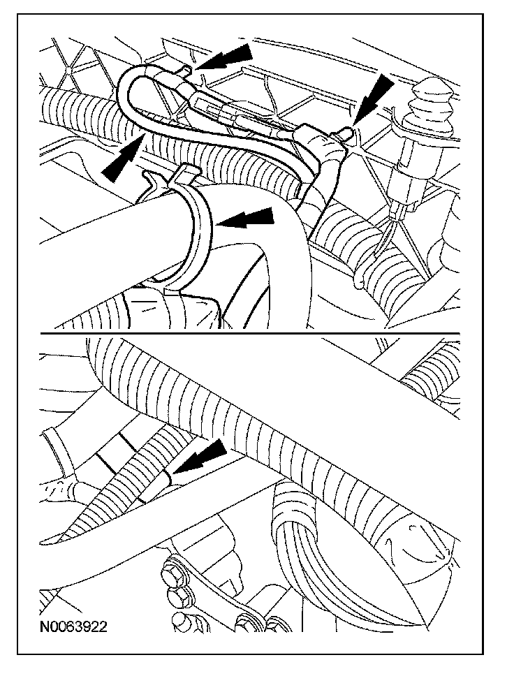 32. If equipped, attach the engine block heater harness to the radiator support, the A/C suction tube and the engine wiring harness.