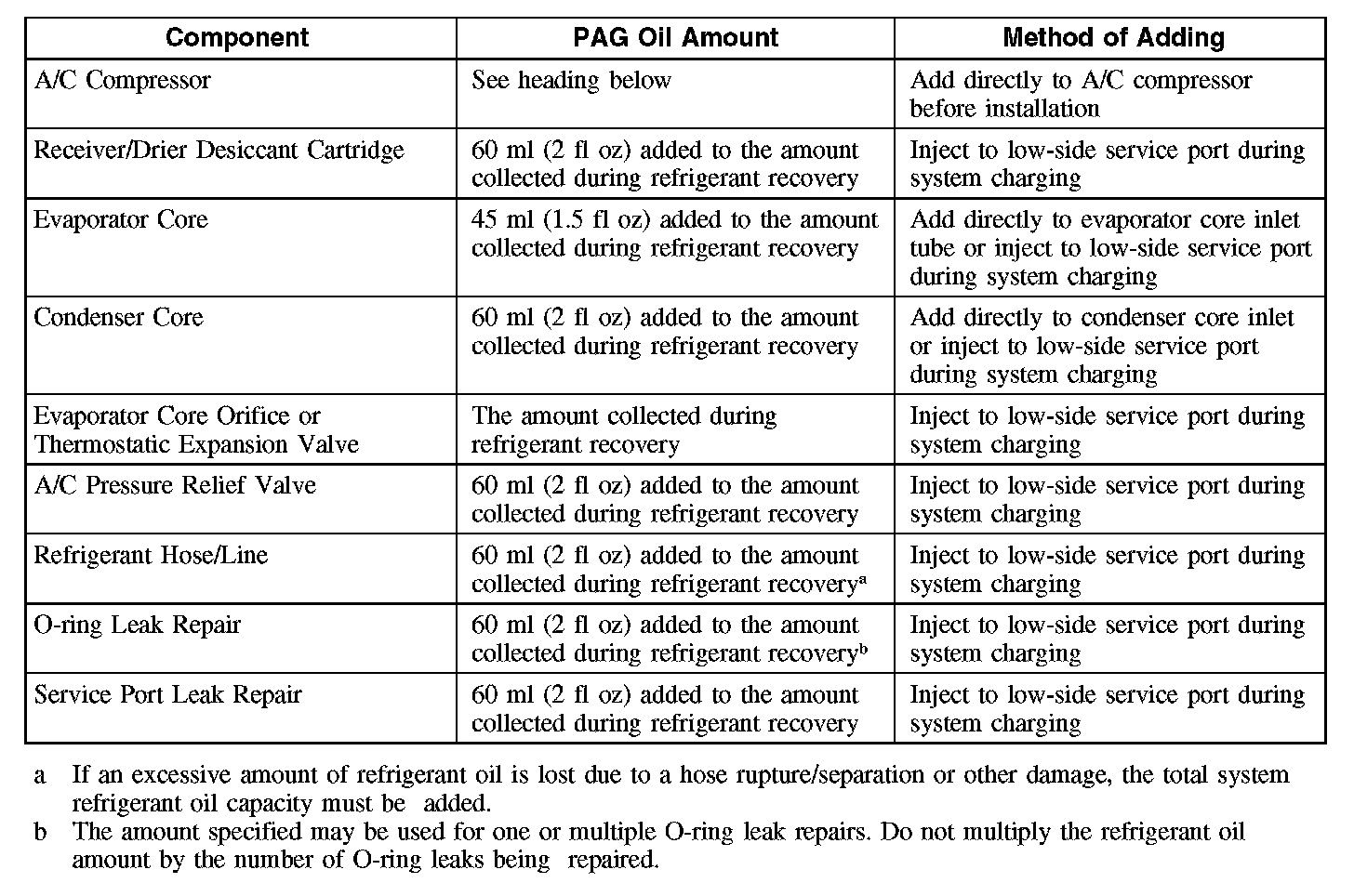 CAUTION: During normal air conditioning (A/C) operation, oil is circulated through the system with the refrigerant, and a small amount is retained in each component. If certain components of the system are removed, some of the refrigerant oil will go with the component. To maintain the original total oil charge, it is necessary to compensate for the oil lost by adding oil to the system with the new part.
