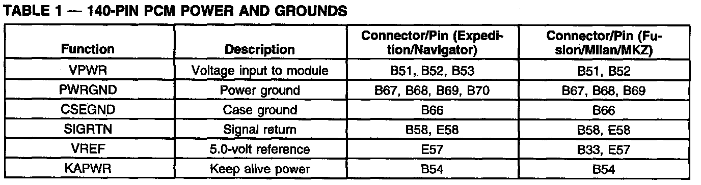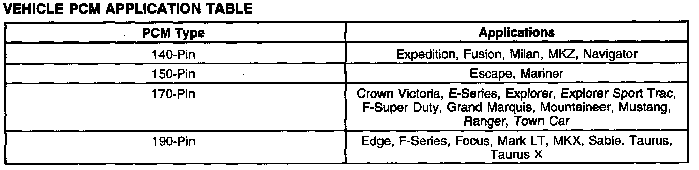 The center of the electronic engine control (EEC) system is a microprocessor called the PCM. The PCM receives input from sensors and other electronic components (switches, relays). Based on the information received and programmed into its memory, the PCM generates output signals to control various relays, solenoids and actuators. There are several different types of PCMs in use for this model year. Refer to the Vehicle PCM Application Table for PCM types and their applications.