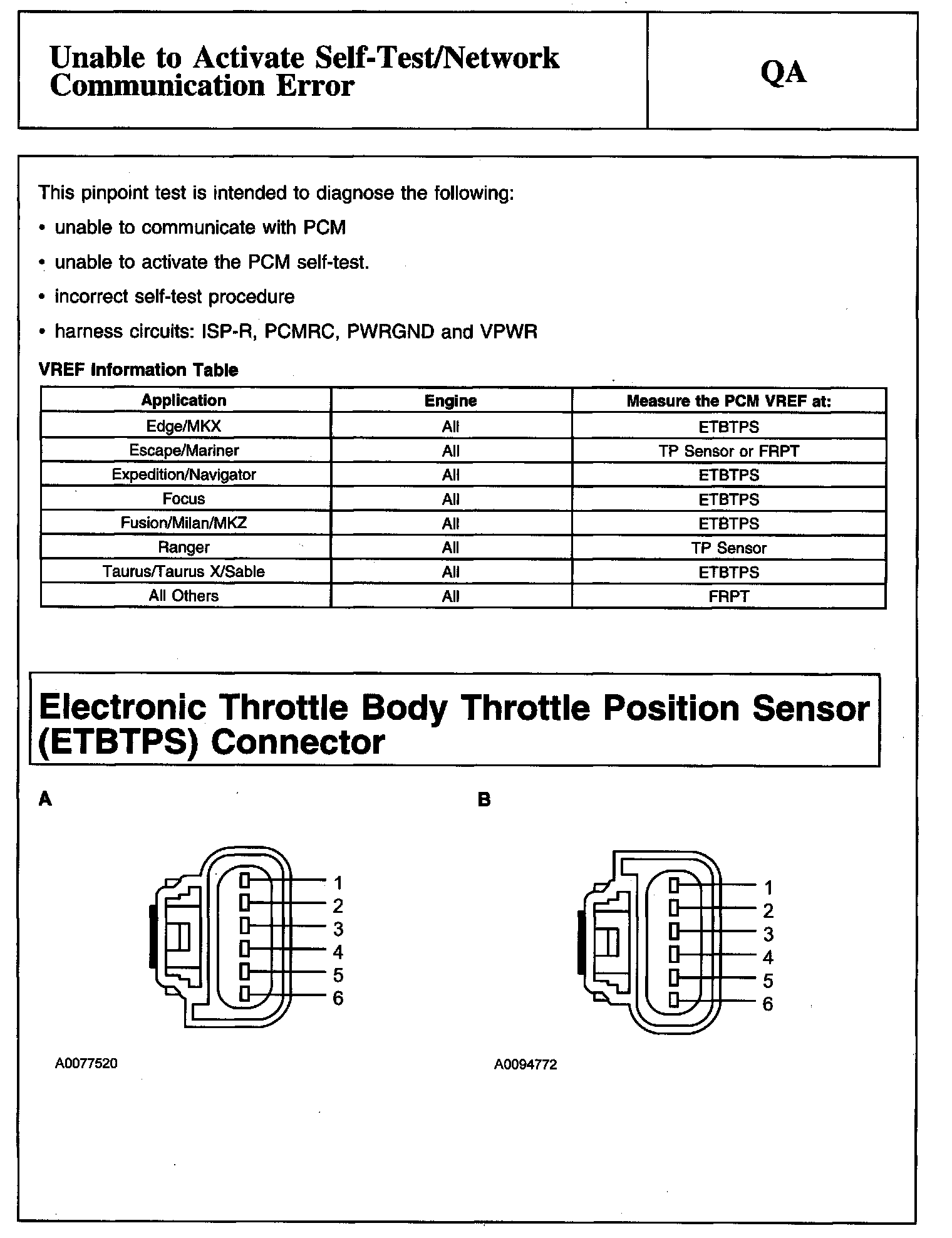 PINPOINT TEST QA: UNABLE TO ACTIVATE SELF-TEST/NETWORK COMMUNICATION ERRORDescription, VREF Information Table And Electronic Throttle Body Throttle Position Sensor (ETBTPS) Connector: