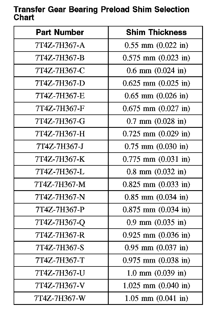 Transfer Gear Bearing Preload Shim Selection Chart: