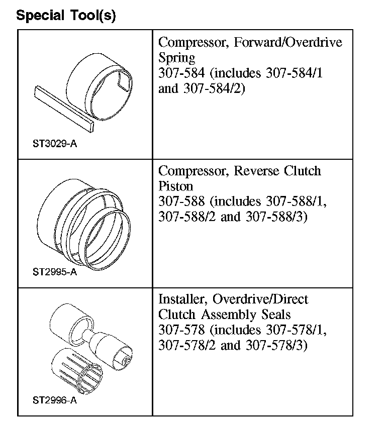 7. Remove Forward/Overdrive Spring Compressor 307-584/2 and Reverse Clutch Piston Compressor 307-588/3.