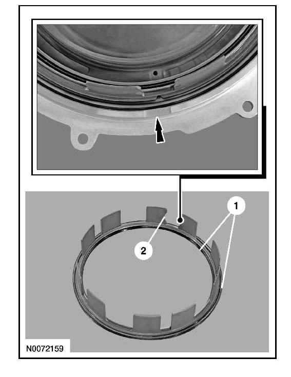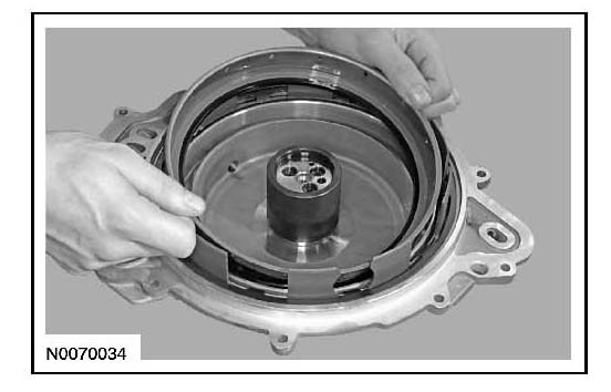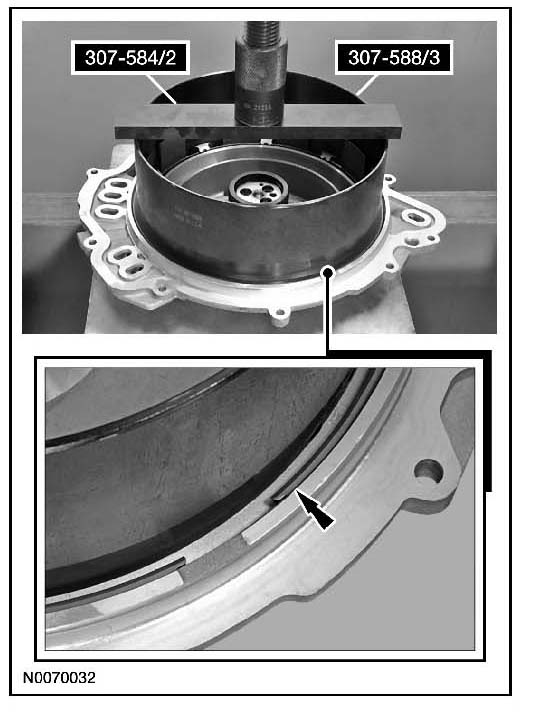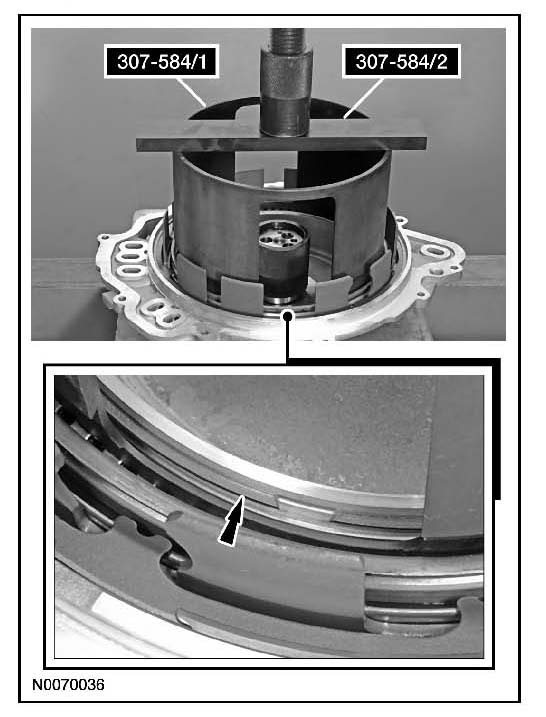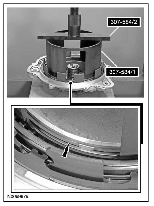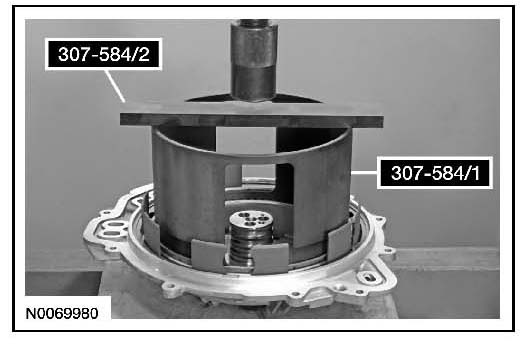 Install Forward/Overdrive Spring Compressor 307-584/1 and 307-584/2. Using a press, compress the intermediate clutch piston return spring, install the snap ring and remove the special tools.