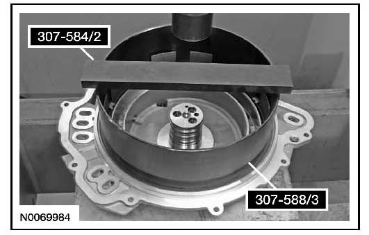 2. Using Forward/Overdrive Spring Compressor 307-584/1 and 307-584/2, compress the intermediate clutch return spring, using a press and remove the snap ring.