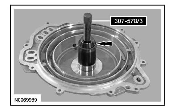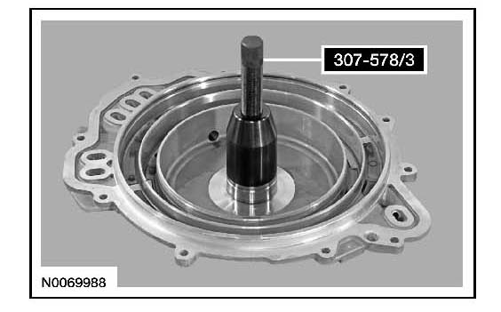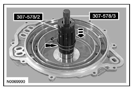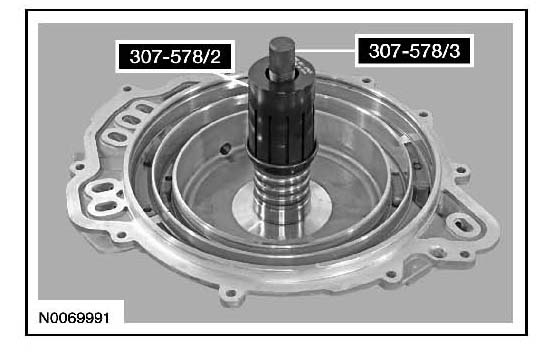 3. Install Overdrive/Direct Clutch Assembly Seal Installer 307-578/2 over 307-578/3. Using special tool 307-578/2, slide the Teflon(R) seal over the cover and into the groove.