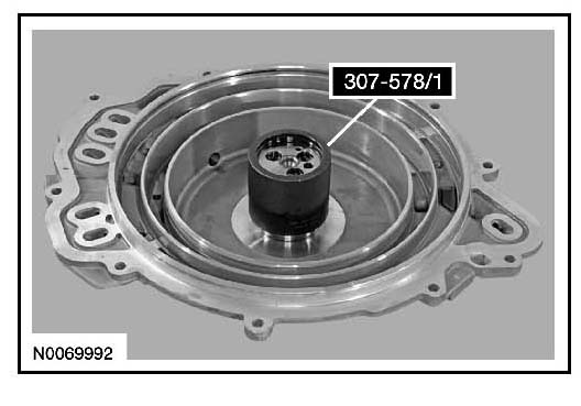 5. Install Overdrive/Direct Clutch Assembly Seal Sizer 307578/1 on the cover to size the 4 Teflon(R) seals.