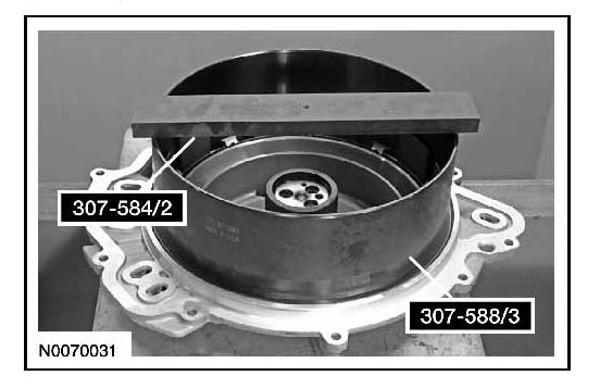 6. Install Forward/Overdrive Spring Compressor 307-584/2 and Reverse Clutch Piston Compressor 307-588/3, using a press, compress the low/reverse clutch return spring and remove the snap ring.