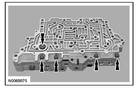 CAUTION: Remove the valves by tapping the valve body on the palm of the hand to slide the valves out of the bores. It may be necessary to remove the valves and springs using a pick. If it is necessary to use a pick, use extreme caution to prevent damaging the valves or valve bores. If necessary, disassemble parts of the main control valve body in small groups. Take special care when handling the main control components, since they are the most precise and delicate parts of the transaxle. Neatly arrange the parts as they are removed to avoid mixing similar pieces.