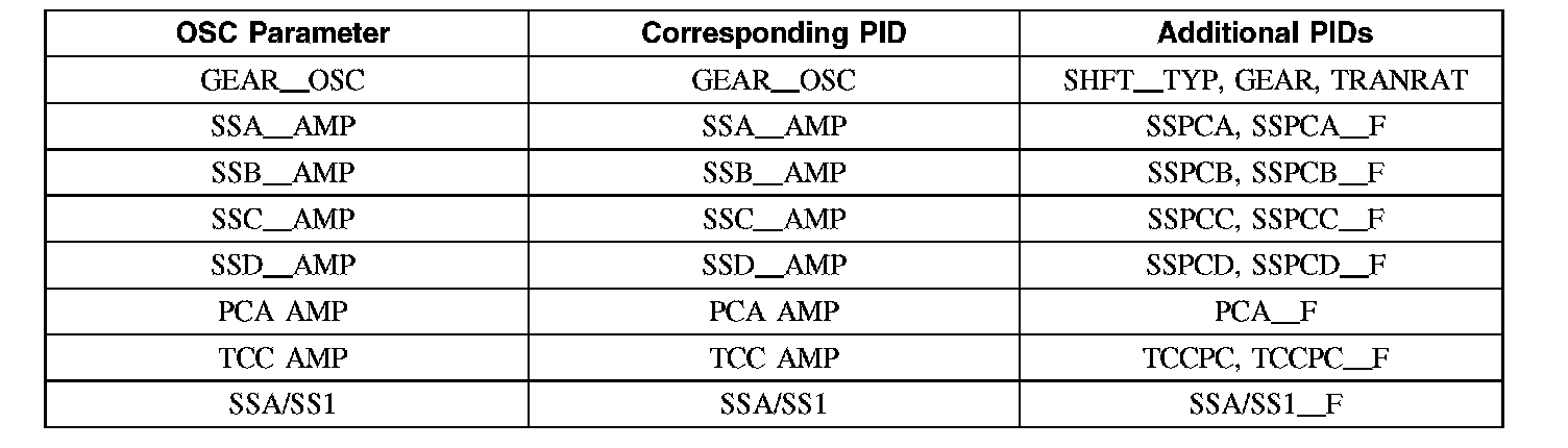 To confirm that the OSC value was sent by the scan tool and the PCM has accepted the OSC command, a corresponding PID for each OSC parameter must be monitored. After SENDING the OSC value, the corresponding PID value should be the same as the OSC value that was sent. Additional PIDs are listed that may be monitored to help the technician accurately diagnose the transaxle.