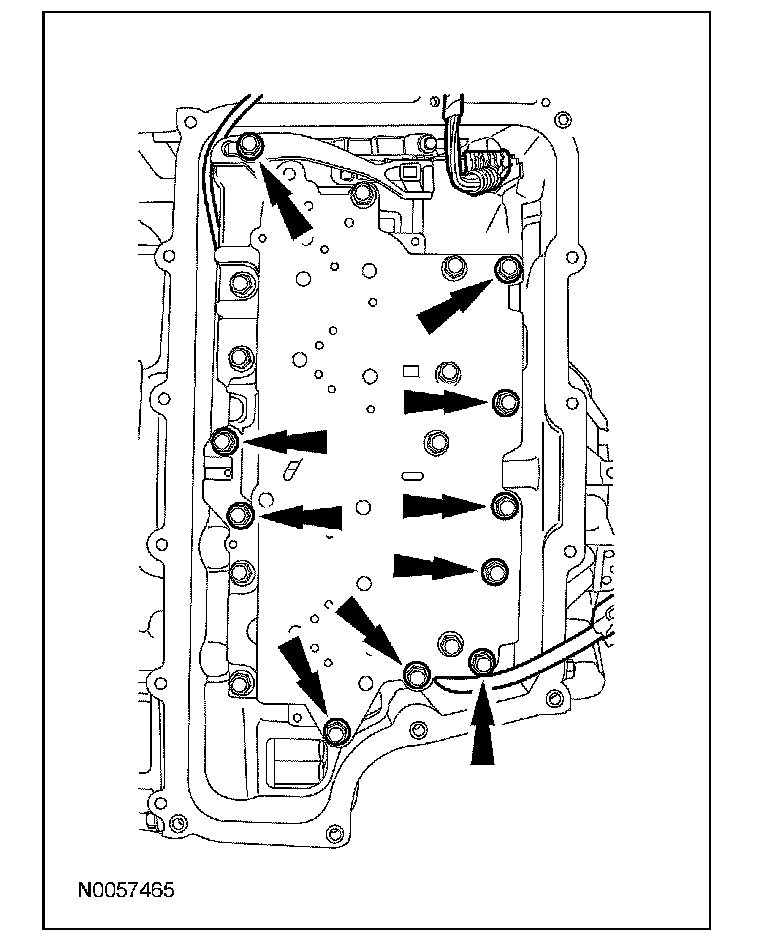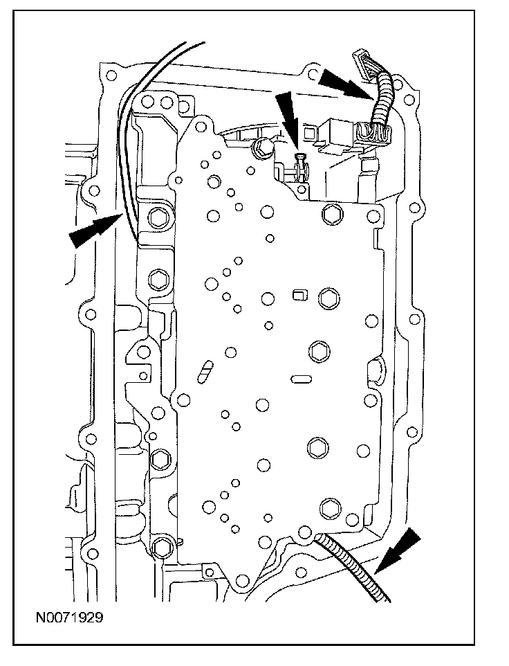 6. CAUTION: Make sure not to pinch the turbine shaft speed (TSS), output shaft speed (OSS) or transmission range (TR) sensor wiring harnesses when installing the solenoid body. Damage to the wiring harness will occur.