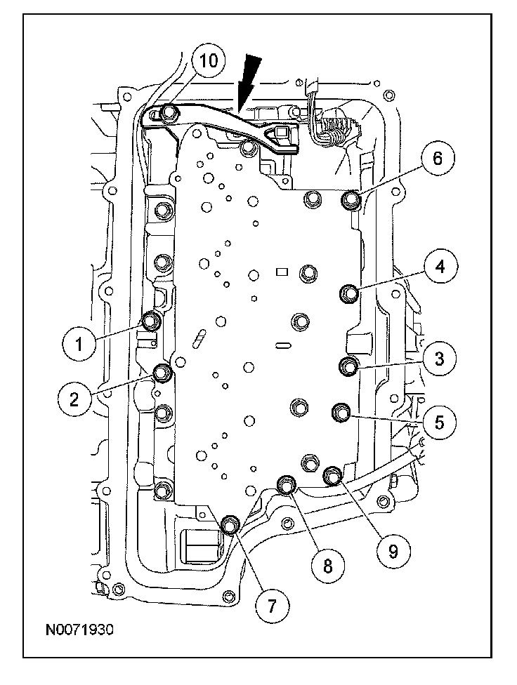 4. Install the TR sensor detent spring and the 10 bolts. Tighten the bolts in the sequence shown.