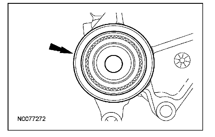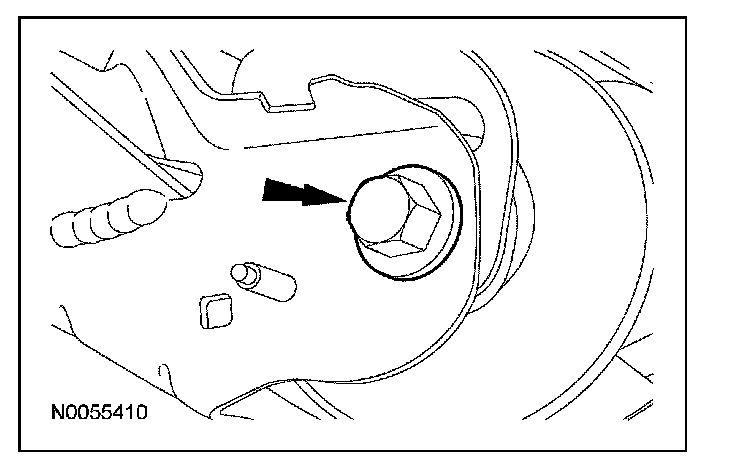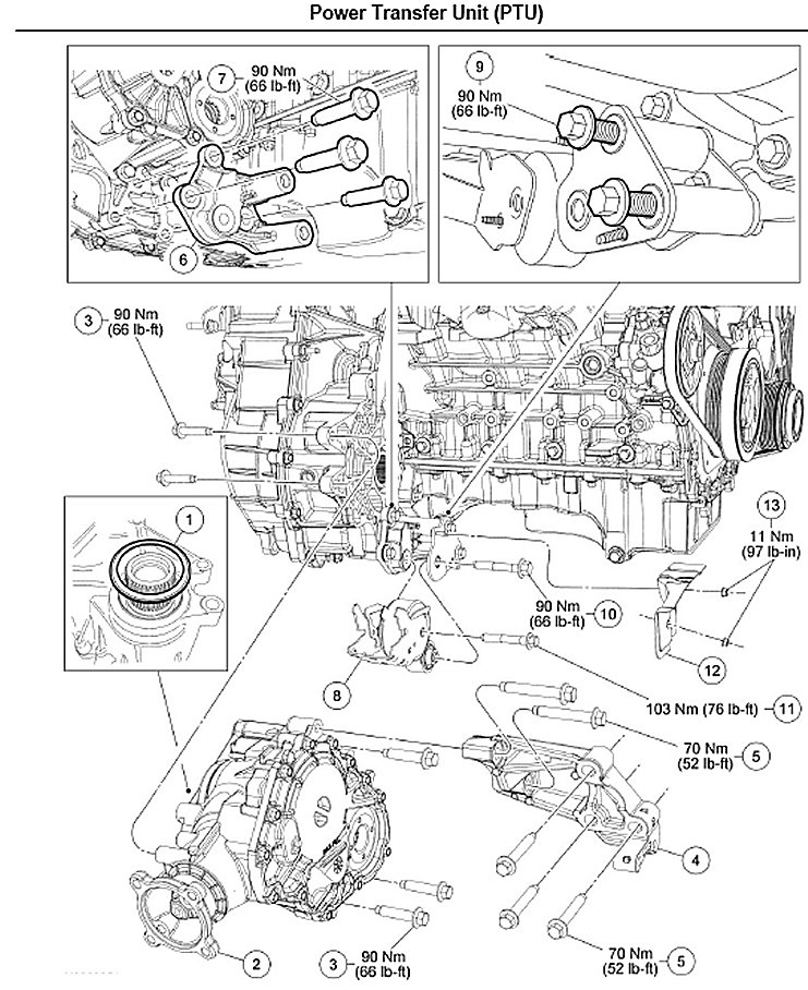 Using a suitable pry bar, move the engine forward. Install a block of wood to hold the engine in the forward position. Install the PTU with the output flange facing the passenger side, filler plug facing upward. Rotate the PTU to the transaxle. Install the 5 PTU-to-transaxle bolts.