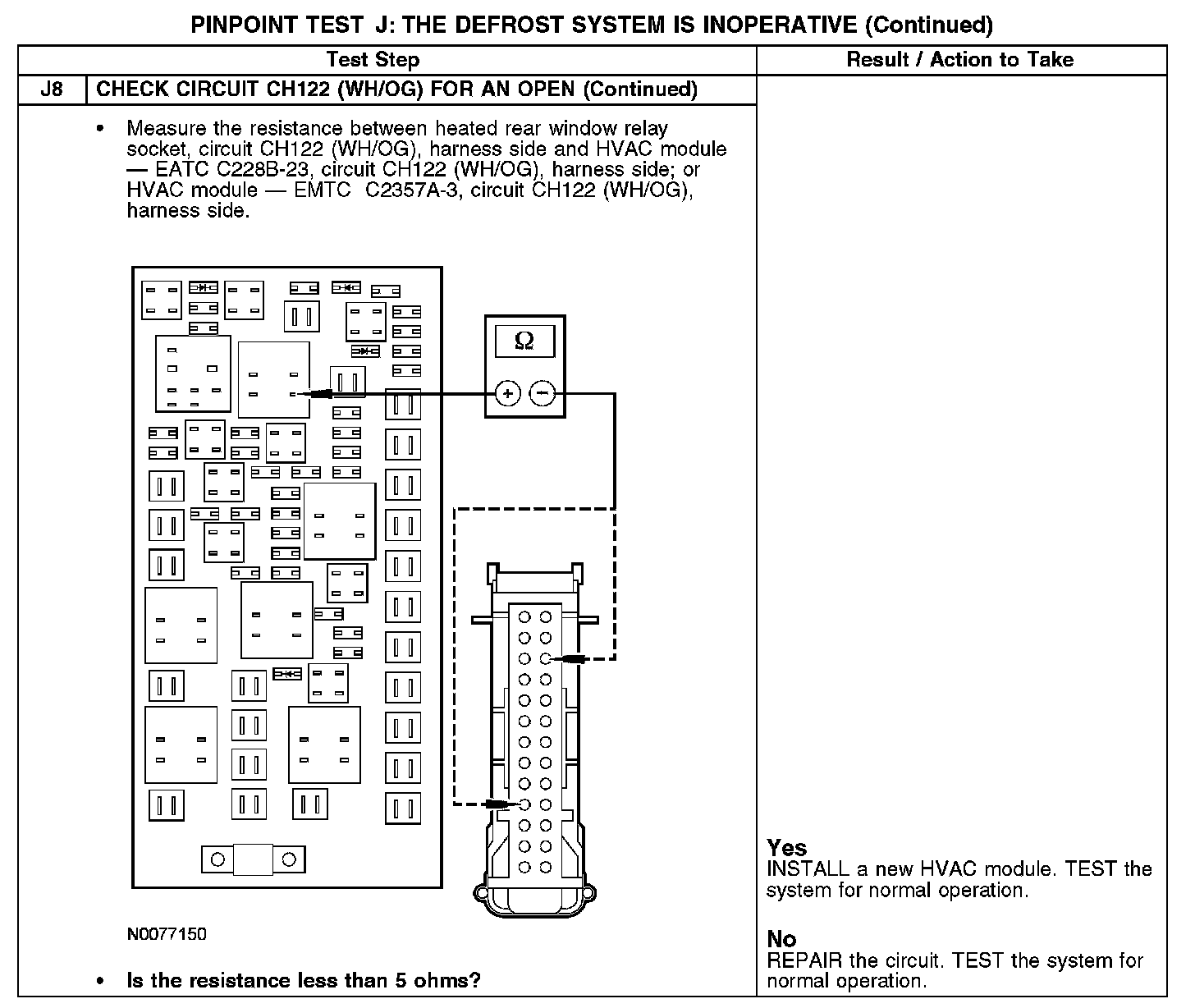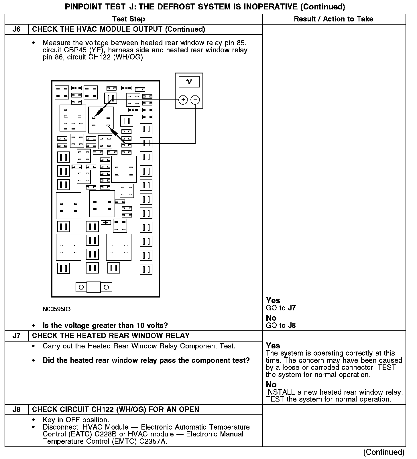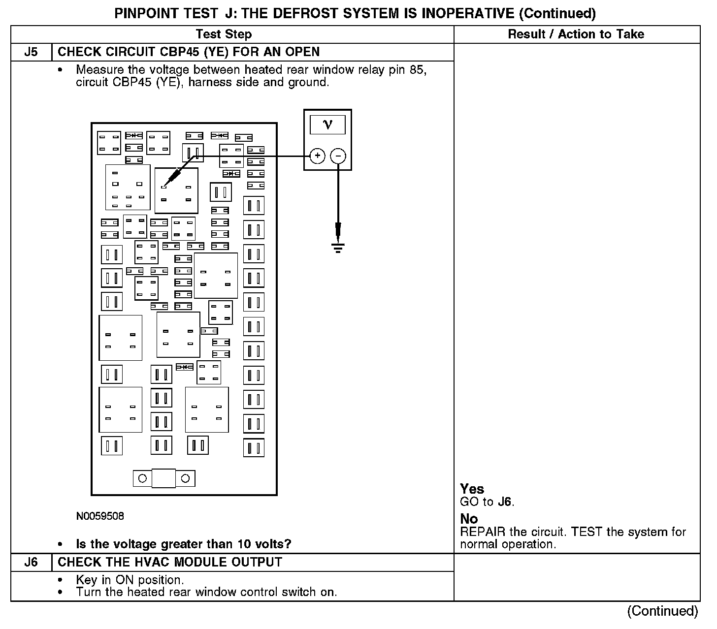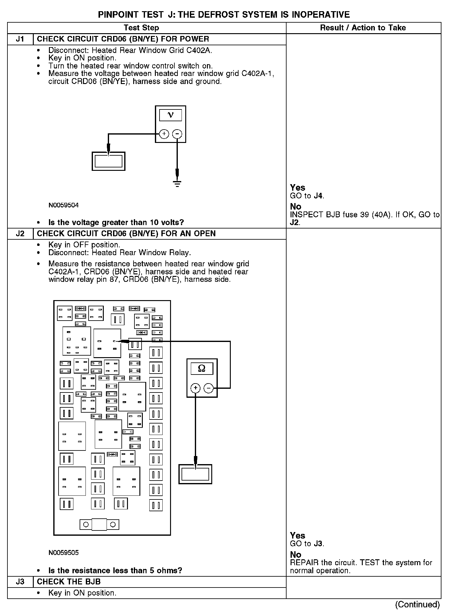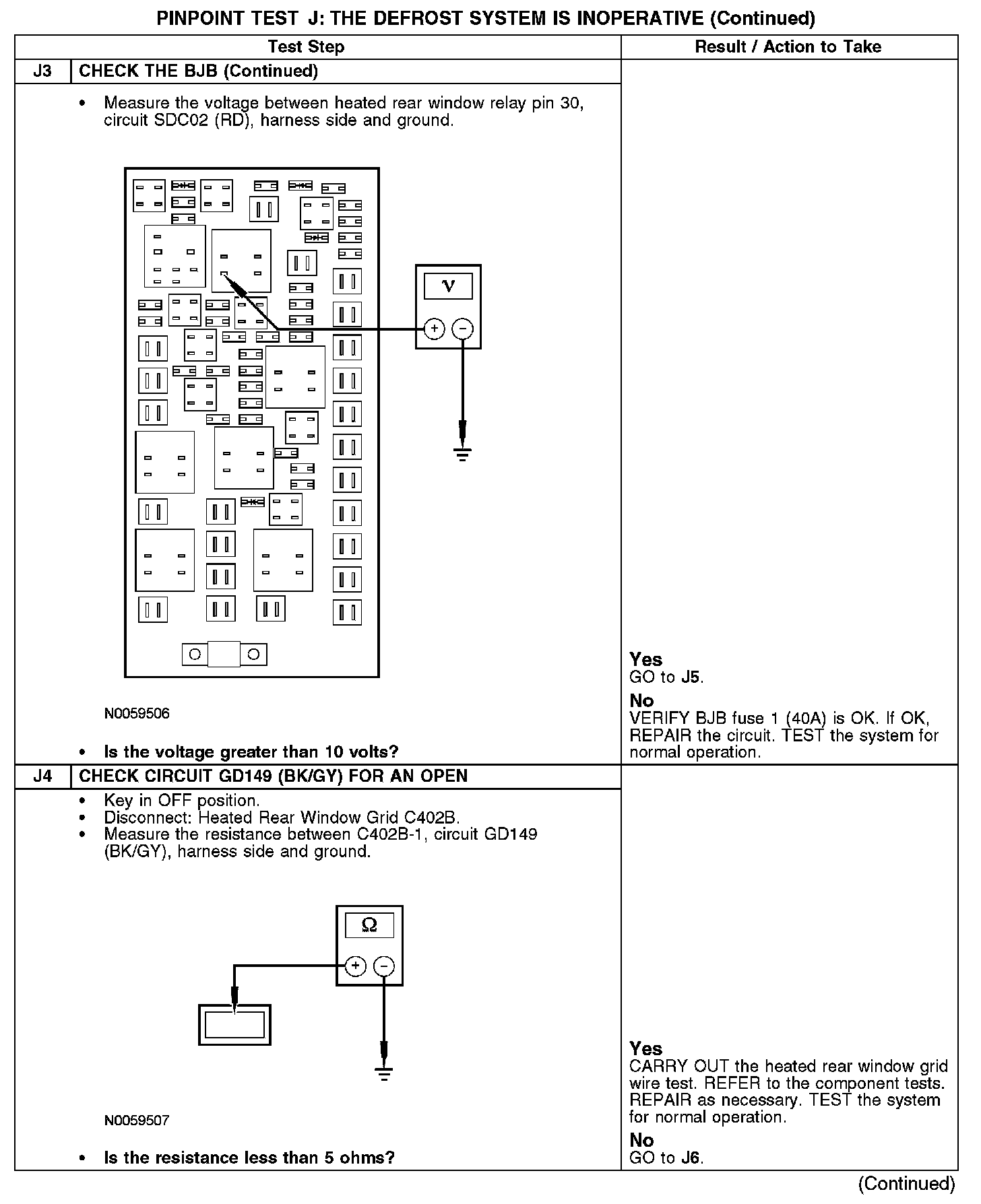 The heated rear window relay, which is integral to the battery junction box (BJB), receives power from circuit CBP45 (YE). When the heated rear window switch is pressed, the HVAC module grounds circuit CH122 (WH/OG) to activate the heated rear window relay. When the heated rear window relay is activated, power is sent from the heated rear window relay to the heated rear window grid through circuit CRD06 (BN/YE). The heated rear window grid is grounded through circuit GD149 (BK/GY).