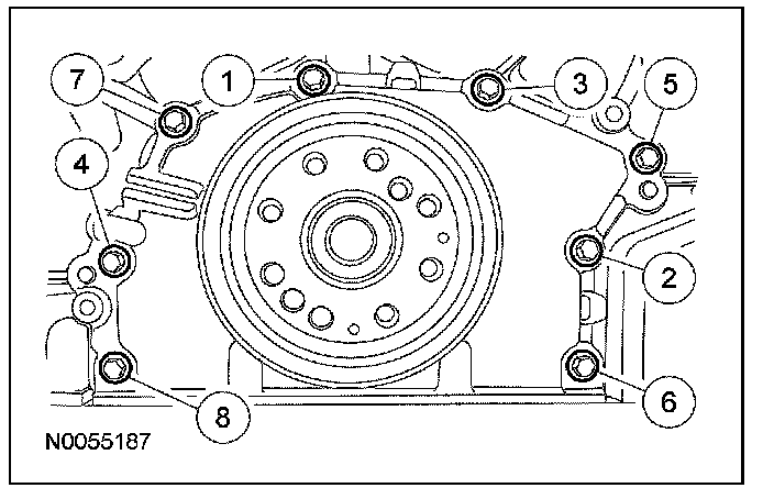 NOTE: The crankshaft rear seal retainer must be installed and the bolts tightened within 4 minutes of sealant application.