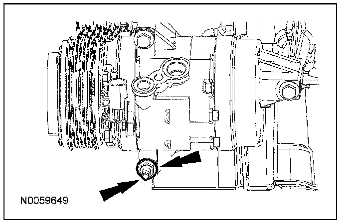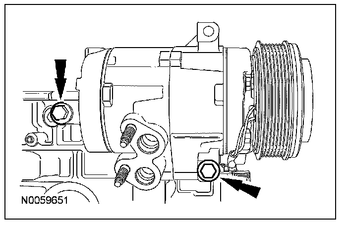 5. NOTE: The A/C compressor must be installed on the cylinder block and the 2 bolts tightened prior to installing the oil pan.