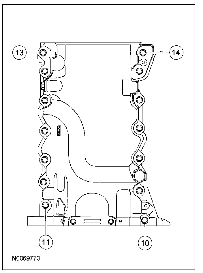 Install the oil pan and bolts 10, 11, 13 and 14.
