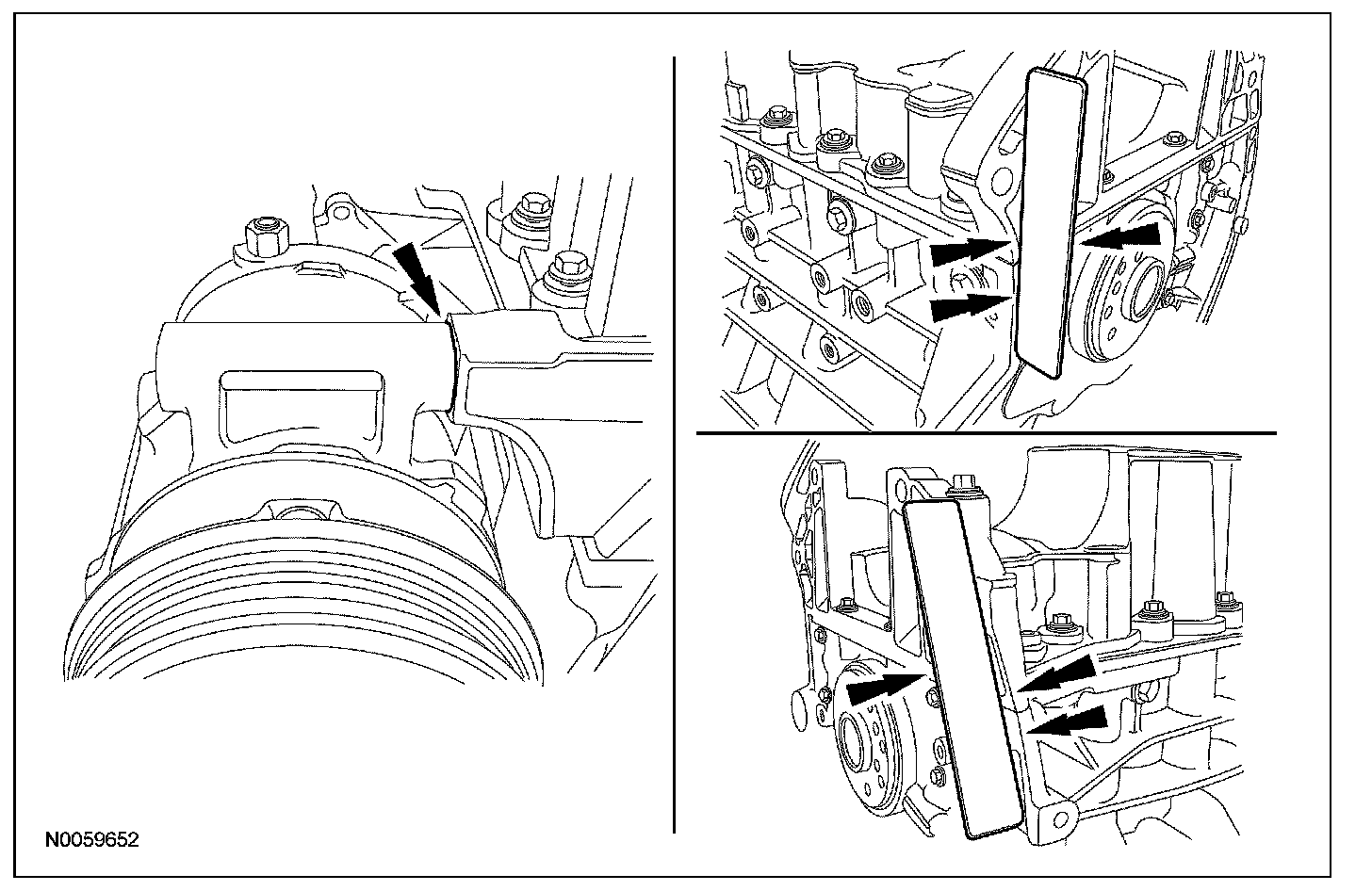 ^ Position the oil pan so the mounting boss is against the A/C compressor and using a straightedge, align the oil pan flush with the rear of the cylinder block at the 2 areas shown.