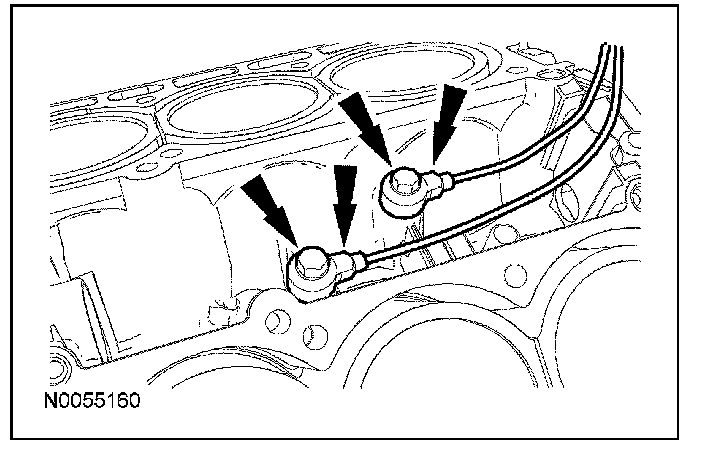 ^ Apply a 5.5 mm (0.21 inch) bead of Motorcraft High Performance Engine RTV Silicone to the 2 crankshaft seal retainer plate-to-cylinder block joint areas on the sealing surface of the oil pan.