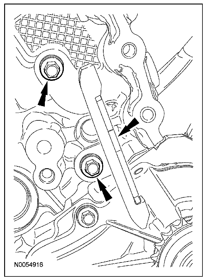 26. Install the RH primary timing chain guide and the 2 bolts.