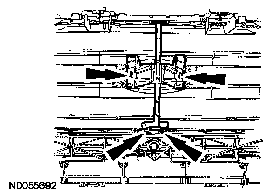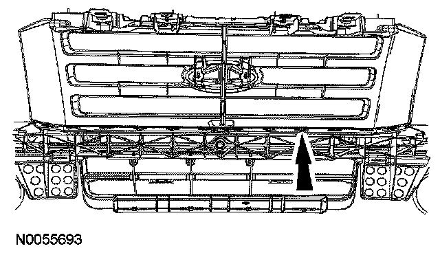 2. Remove the 4 bumper assembly-to-grille bracket retainer nuts and the bumper assembly-to-grille bracket.