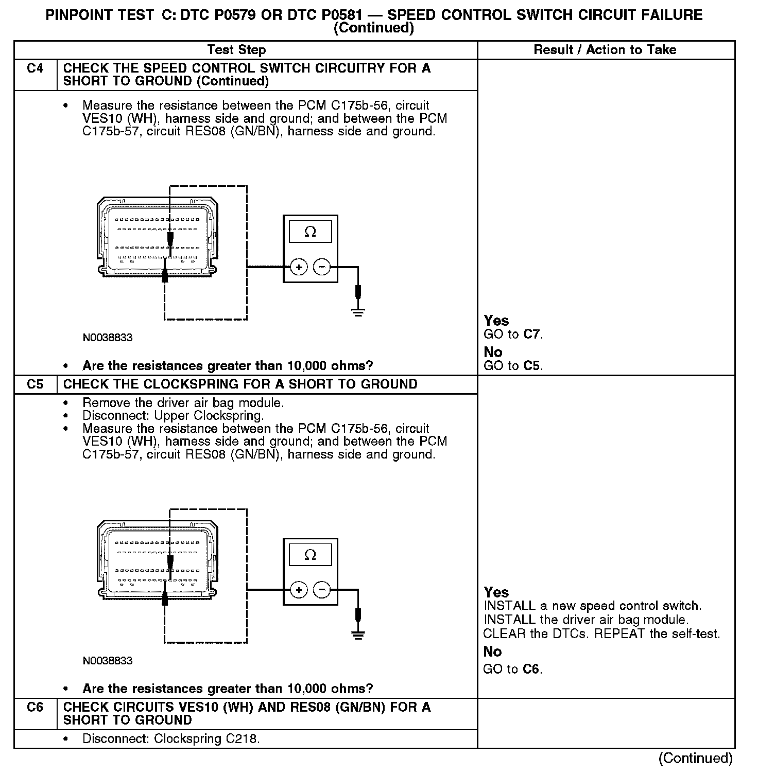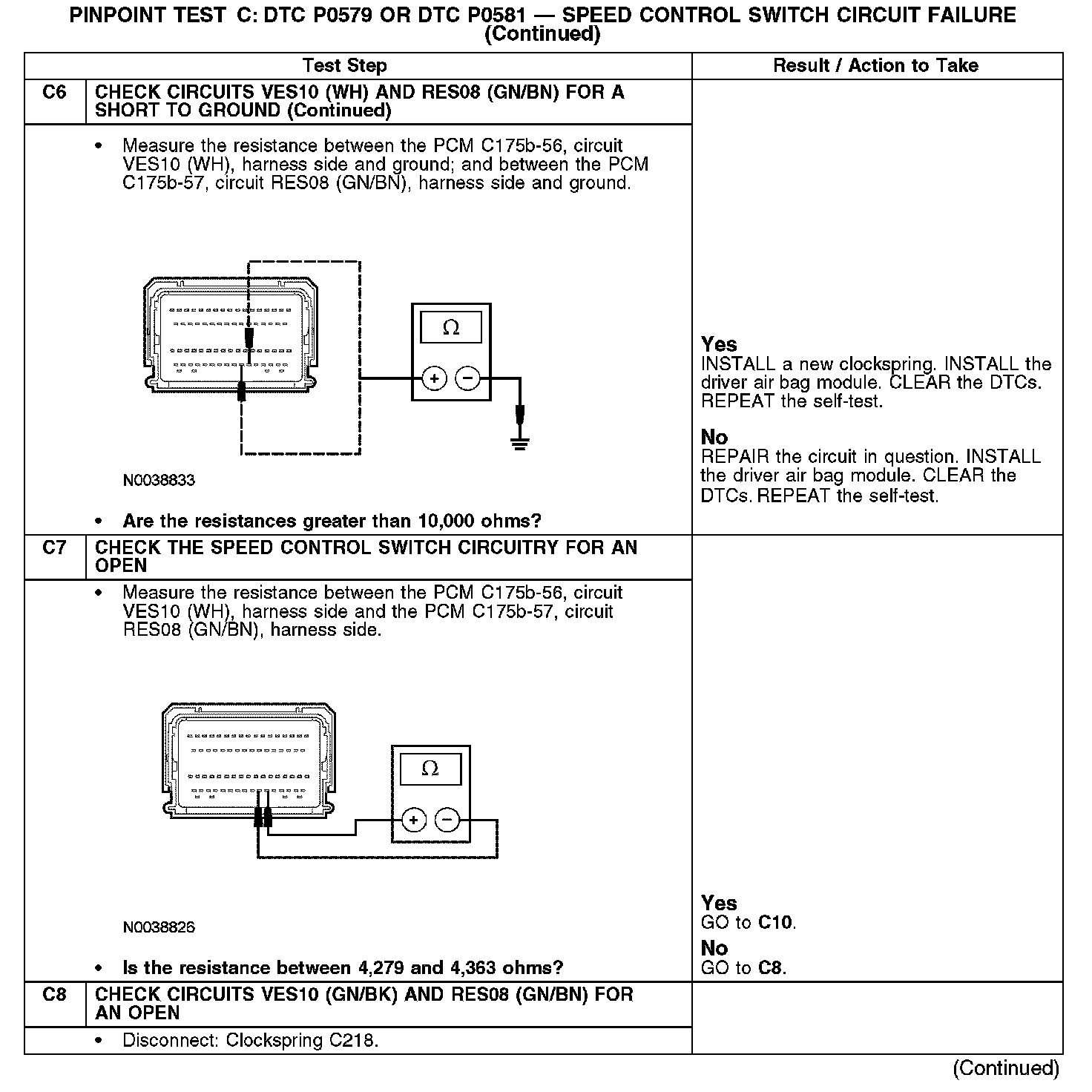 The PCM sends a signal through circuit VES10 (WH) to the speed control switches, which passes through the clockspring. The return signal is sent to the PCM through circuit RES08 (GN/BN) and the clockspring.