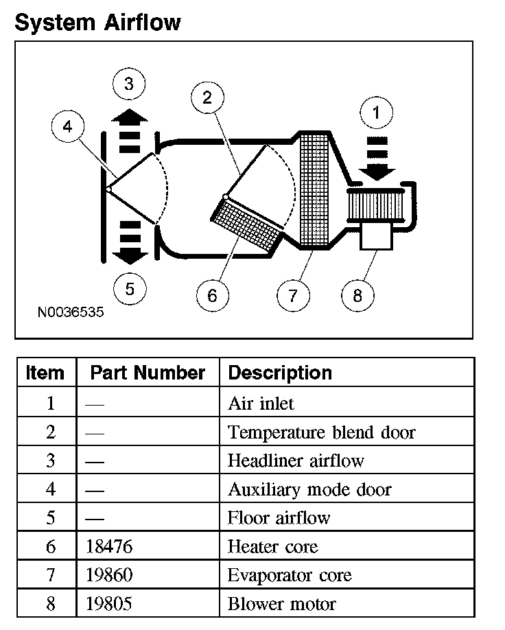 The evaporator core is an aluminum plate/fin type and is located in the auxiliary climate control housing. A mixture of refrigerant and oil enters the bottom of the evaporator core through the evaporator core inlet tube and then moves out of the evaporator core through the evaporator core outlet tube. When the A/C compressor is operating, air from the blower motor is cooled and dehumidified as it flows through the evaporator core fins.
