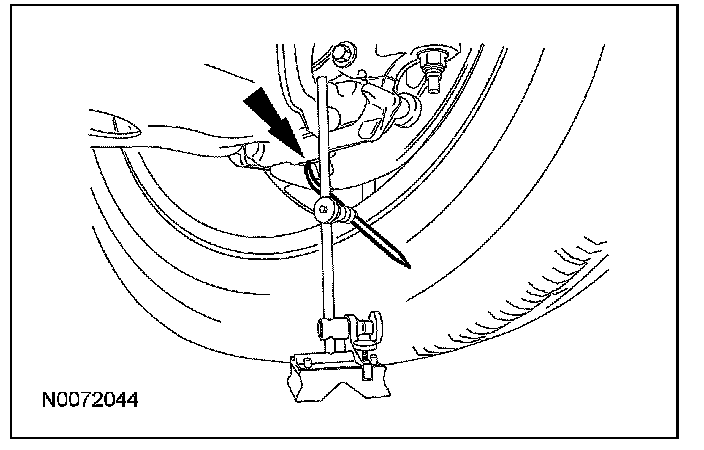 3. Position the surface gauge on the same flat, level surface as used in Step 1, adjust the gauge's arm until the scriber point is located on the lower surface of the wheel knuckle near the ball joint.