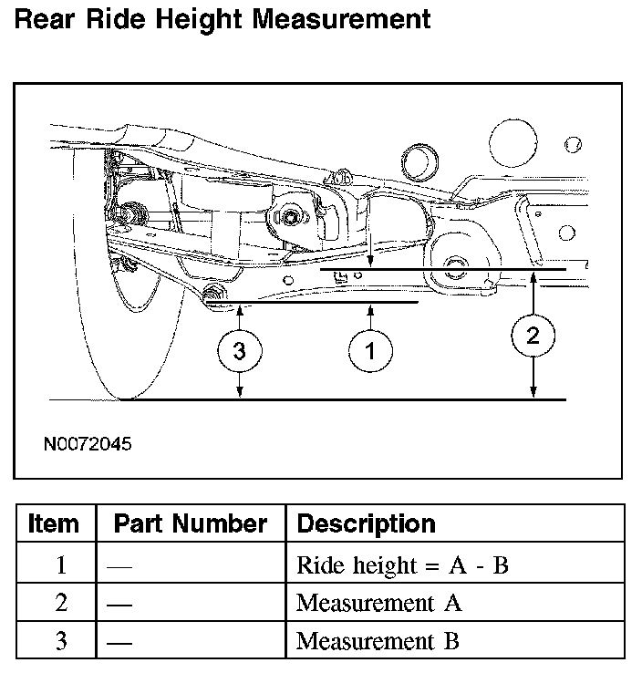 Rear Ride Height MeasurementNOTE: Make sure that the vehicle is positioned on a flat, level surface and the tires are inflated to the correct pressure. Vehicle should have a full tank of fuel.